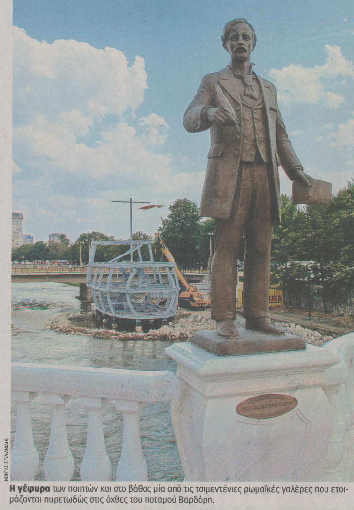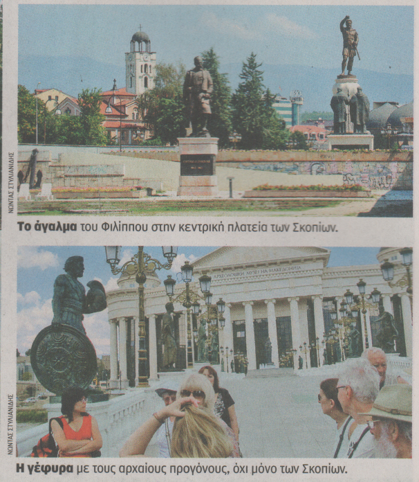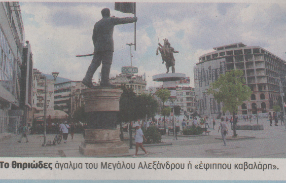 Οι θαμώνες των πολλών καφετεριών στην κεντρική πλατεία «Μακεδονίας» στα Σκόπια, απολαμβάνουν τον καφέ τους, μέσα σ’ ένα «δάσος» από ανδριάντες και οι περιπατητές στην όχθη του Βαρδάρη (Αξιός) οσονούπω θα μπορούν να «ταξιδεύουν» με… ρωμαϊκές γαλέρες. Στη μέση της πλατείας βρίσκεται το θηριώδες άγαλμα του Μεγάλου Αλεξάνδρου, ή «έφιππου καβαλάρη» όπως επισήμως ονομάστηκε για να μη θεωρηθεί ότι παραβιάζεται το πνεύμα της Ενδιάμεσης Συμφωνίας με την Ελλάδα. Ο μεγάλος στρατηλάτης καβάλα στον Βουκεφάλα έτοιμος να εφορμήσει και στη βάση του φαραωνικού έργου κάποιες ώρες της ημέρας ένας ξεναγός ντυμένος…αρχαίος Μακεδόνας, με περικεφαλαία και χλαμύδα, ενημερώνει τους επισκέπτες για τα περασμένα μεγαλεία!