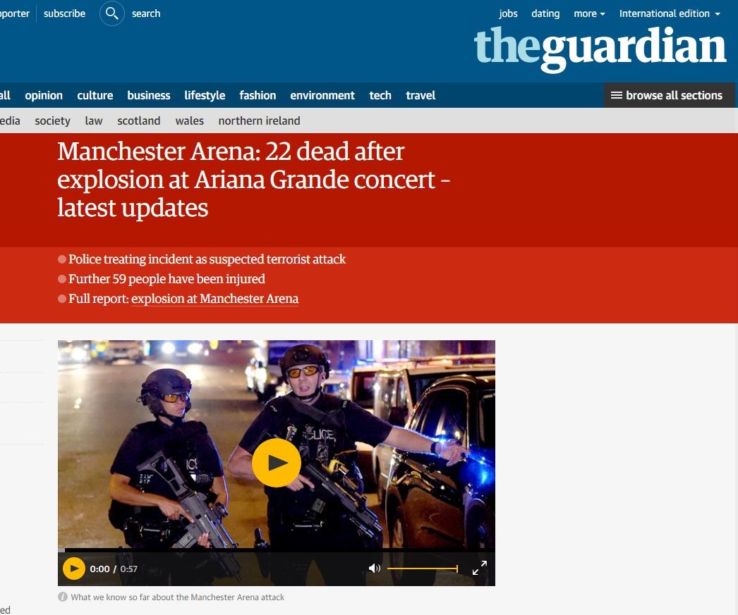Η βρετανική εφημερίδα Guardian αναφέρει ότι οι νεκροί από την φονική έκρηξη που σημειώθηκε στον συναυλιακό χώρο στο Μάντσεστερ είναι 22 και τουλάχιστον 59 οι τραυματίες.