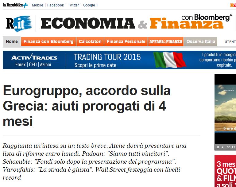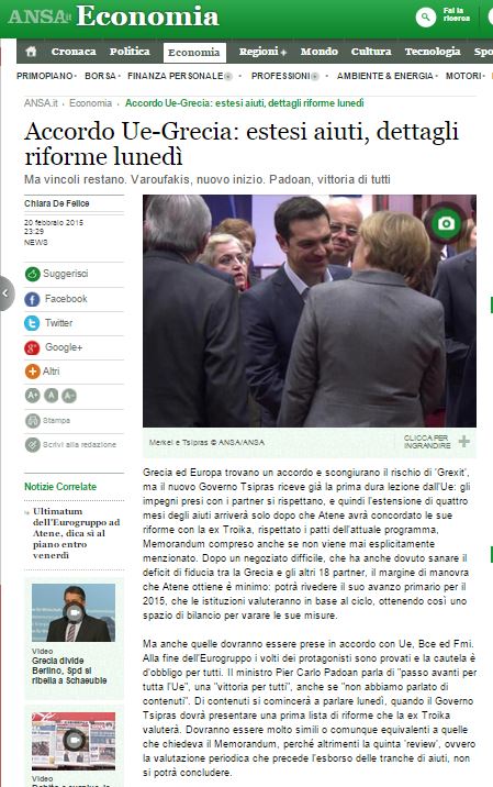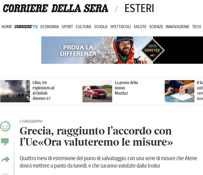 Η εφημερίδα της Ρώμης αναφέρει ότι «η συμφωνία βασίζεται, σε τέσσερα σημεία: επέκταση της βοήθειας για τέσσερις μήνες, ολοκλήρωση της αξιολόγησης των μέτρων πριν την καταβολή νέας βοήθειας, απαρίθμηση των μεταρρυθμίσεων μέχρι την Δευτέρα και σεβασμός των συμφωνηθέντων. Η Ελλάδα δεσμεύθηκε, αφού θα συμφωνηθούν τα μέτρα, να μην τα αλλάξει ή να τα αποσύρει μονομερώς, σε περίπτωση που έχουν επιπτώσεις επί του δημόσιου προϋπολογισμού».