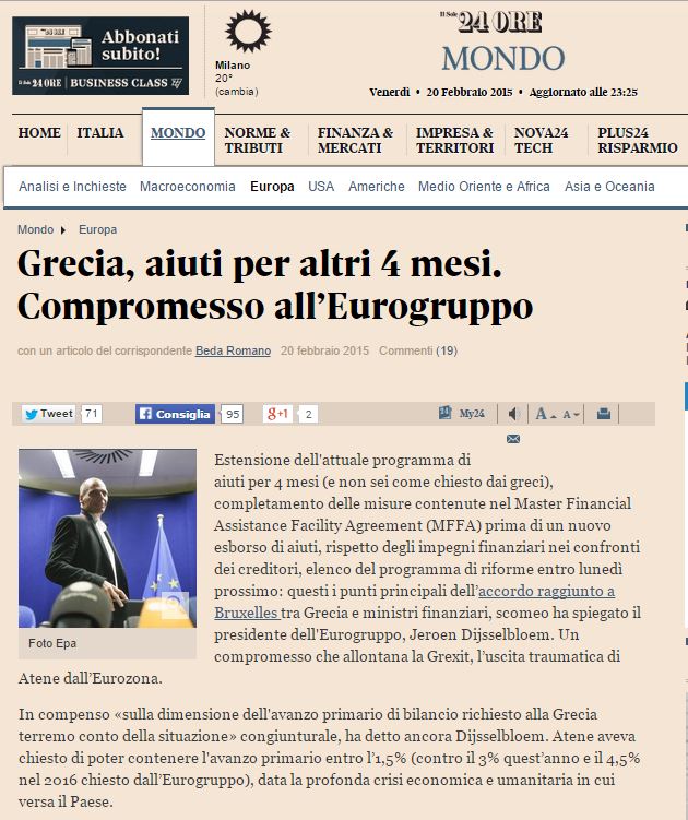 «Ελλάδα, βοήθεια για άλλους τέσσερις μήνες. Συμβιβασμός στο Γιούρογκρουπ», γράφει, τέλος, η οικονομική εφημερίδα Il Sole 24 Ore.