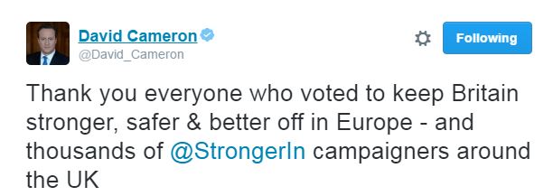 Ο Ντέιβιντ Κάμερον έγραψε ότι: « Σας ευχαριστώ που ψήφισατε να διατηρήσει η Βρετανία δυνατότερη, ασφαλέστερη και καλύτερη ζωή στην Ευρώπη – και χιλιάδες @StrongerIn εκστρατείες γύρω από το Ηνωμένο Βασίλειο».