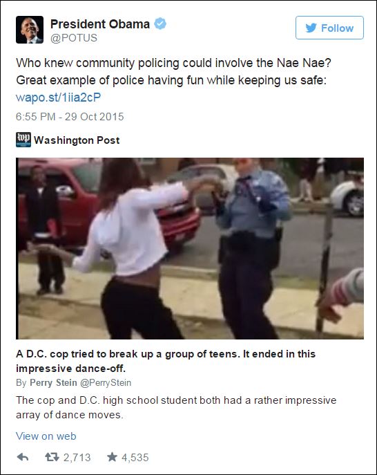 Λευκή αστυνομικός παρενέβη στην αρχή της εβδομάδας σε καυγά μεταξύ κοριτσιών αφροαμερικανικής καταγωγής σε πάρκο συνοικίας της Ουάσινγκτον και κατέληξε να προκαλέσει σε χορευτική μονομαχία τη μία από αυτές. Το βίντεο έγινε viral και ο Μπαράκ Ομπάμα σχολίασε με ενθουσιασμό τη σκηνή μέσω του προσωπικού του προσωπικού του λογαριασμού στο Twitter “Ποιος θα μπορούσε να σκεφτεί ότι η αστυνόμευση της γειτονιάς μπορεί να γίνει με ‘Nae Nae’; Σούπερ παράδειγμα ότι η αστυνομία μπορεί να διασκεδάζει προστατεύοντάς μας”.