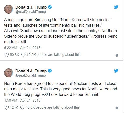Ο Αμερικανός πρόεδρος εκδήλωσε αμέσως την ικανοποίησή του για την ανακοίνωση του Κιμ Γιονγκ Ουν, στην οποία είδε «μια πολύ καλή είδηση για τη Βόρεια Κορέα και τον κόσμο». «Μεγάλη πρόοδος! Αδημονώ για τη Σύνοδο μας», συμπλήρωσε ο Τραμπ μέσω Twitter.