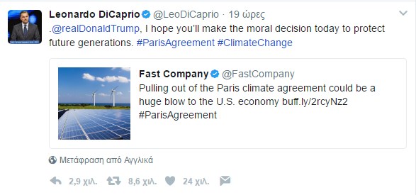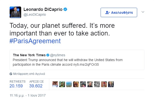 “Σήμερα, ο πλανήτης μας υποφέρει. Είναι σημαντικότερο από ποτέ να αναλάβουμε δράση”, έγραψε στο Twitter ο 43χρονος ηθοποιός απογοητευμένος από την απόφαση αυτή. Μια μέρα νωρίτερα είχε γράψει: “@realDonaldTrump, Ελπίζω να λάβεις σήμερα την ηθική απόφαση να προστατεύσεις τις μελλοντικές γενιές”.