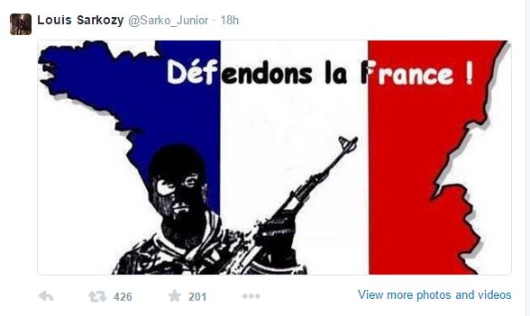 Ο Λουί Σαρκοζί εξέφρασε τα συλλυπητήριά του στις οικογένειες των θυμάτων του Charlie Hebdo και ανάρτησε τον χάρτη της Γαλλίας με τα χρώματα της σημαίας κι ένα οπλισμένο άνδρα. Η λεζάντα της φωτογραφίας γράφει: «Ας υπερασπιστούμε τη Γαλλία».