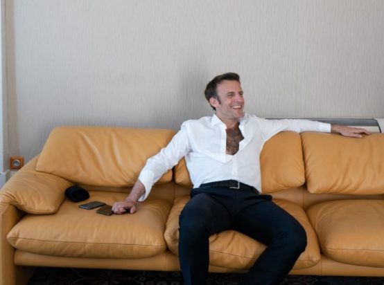 Ο Γάλλος πολιτικός κάθεται χαλαρά στον καναπέ έπειτα από το τέλος της ομιλίας του. Έχει βγάλει την γραβάτα και έχει ανοίξει μερικά κουμπιά από το πουκάμισο, ενώ το χαμόγελο του δείχνει ότι η βραδιά ολοκληρώθηκε με επιτυχία.