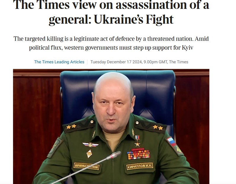 Σε σημερινό τους άρθρο οι Times, έκρινε ότι η δολοφονία του Ρώσου αντιστρατήγου ήταν «πράξη αυτοάμυνας από την πλευρά μιας απειλούμενης χώρας». «Εκτός από εγκληματίας πολέμου, ο Κιρίλοφ ήταν ένας ψεύτης στην υπηρεσία της βαρβαρότητας», τονίζει το κύριο άρθρο, που αποτελεί και θέση της εφημερίδας.