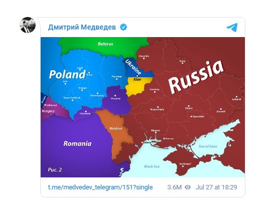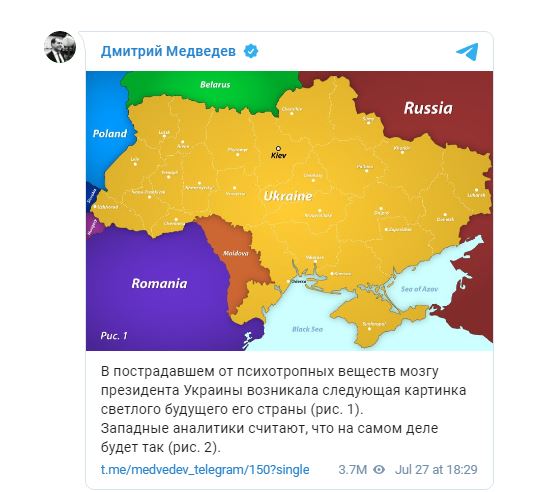 Συγκεκριμένα, ο πρώην πρόεδρος της Ρωσίας, στις 27 Ιουλία ανάρτησε στο Telegram δύο χάρτες. Ο πρώτος από αυτούς έδειχνε το ουκρανικό έδαφος να περιλαμβάνει την Κριμαία και τις δύο ανατολικές περιοχές του Ντονέτσκ και του Λουχάνσκ.«Στο επηρεασμένο από ψυχοτρόπες ουσίες μυαλό του προέδρου της Ουκρανίας, αυτή είναι η εικόνα για το λαμπρό μέλλον της χώρας του», έγραψε στη λεζάντα του πρώτου αυτού χάρτη.