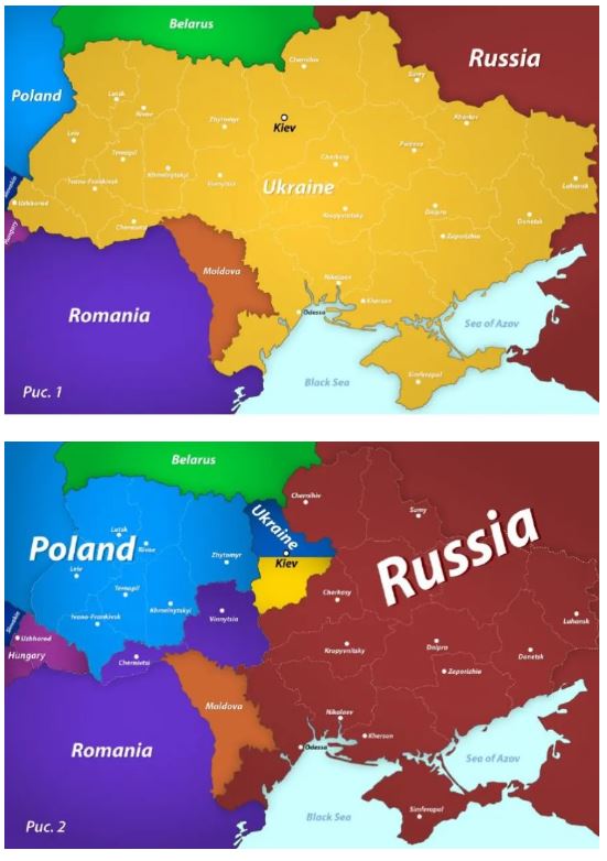 Ο δεύτερος χάρτης αποτύπωσε μια κατακερματισμένη Ουκρανία, με τα περισσότερα εδάφη της να έχουν προσαρτηθεί από την Πολωνία, την Ουγγαρία, τη Ρουμανία και κυρίως τη Ρωσία. «Δυτικοί αναλυτές πιστεύουν ότι στην πραγματικότητα θα μοιάζει κάπως έτσι», γράφει στην ανάρτησή του για τον δεύτερο χάρτη, χωρίς να εξηγεί πάντως σε ποιους αναλυτές αναφέρεται.