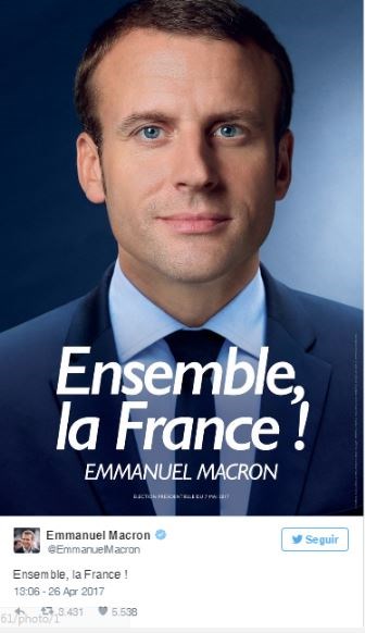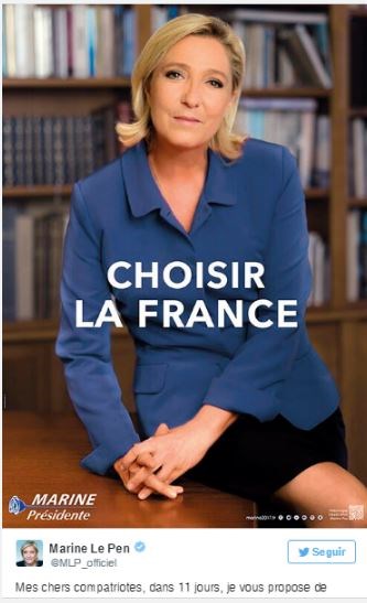 Κάποιος βέβαια θα μπορούσε να προσθέσει πως είναι επίσης η πρώτη φορά σε αυτήν την προεκλογική εκστρατεία που η Λεπέν φορά φούστα. Για τον ίδιον ειδικό, πρόκειται για μία προσπάθεια να αναδείξει η ακροδεξιά υποψήφια την πιο καθησυχαστική και θηλυκή της πλευρά. Κάτι που είχε πασχίσει να προβάλει και στον πρώτο γύρο, εμφανιζόμενη ως «μητέρα οικογενειάρχης» (έχει τρία παιδιά, όμως είναι και δις χωρισμένη). Ωστόσο μία πηγή του κόμματός της υπογραμμίζει στο γαλλικό περιοδικό L’ Express κι άλλη μία ερμηνεία για τη φούστα της Λεπέν: «είναι μία κρυφή αναφορά στο Ισλάμ», όπως τόνισε ένα στέλεχος του επιτελείου της. Η ιδέα του μηνύματος αυτού είναι πως στη Γαλλία οι γυναίκες «ντύνονται όπως τους αρέσει». Στην προεκλογική της εκστρατεία, η Λεπέν είχε συνδέσει άμεσα το Ισλάμ με τον ριζοσπαστισμό και την τρομοκρατία. Η φωτογραφία της Μαρίν εμπεριέχει κι άλλο ένα υποδόριο μήνυμα: ποζάρει μπροστά από μία βιβλιοθήκη γεμάτη βιβλία, μία εικόνα που συνήθως παραπέμπει στους ήδη εκλεγμένους προέδρους, όχι σε αυτούς που ακόμη είναι υποψήφιοι.Μολονότι με λιγότερη σαφήνεια, και η αφίσα του Μακρόν κάνει ένα νεύμα προς τη μεριά των ψηφοφόρων της δεξιάς, μία δεξαμενή από την οποία προσπαθεί, όπως κι η Λεπέν, να αντλήσει ψήφους.Το νέο σύνθημα του ηγέτη του En Marche! παραπέμπει αμέσως σε άλλα, κλασικά συνθήματα δεξιών υποψηφίων. Ιδίως εκείνο του δεξιού Ζακ Σιράκ, όταν το 2002 για πρώτη φορά είχε προκριθεί στον β’ γύρο ο υποψήφιος του FN, ο πατέρας της Λεπέν. Τότε ο Σιράκ είχε επιλέξει ως σύνθημα το ‘La France ensemble”, η Γαλλία μαζί— ή πιο ελεύθερα η Γαλλία ενωμένη–, την ώρα που το σημερινό σύνθημα του Μακρόν Ensemble, la France! Μοιάζει σαν η εικόνα της φράσης του Σιράκ ιδωμένη στον καθρέφτη. Ανάλογο σύνθημα είχε χρησιμοποιήσει το 2007 κι ο Σαρκοζί: «Μαζί όλα γίνονται δυνατά» . Επιπλέον όλα στην αφίσα του Μακρόν, στην οποία παρουσιάζεται σε κοντινό πλάνο το πρόσωπό του μόλις να χαμογελά, έχουν γαλάζιες-μπλε αποχρώσεις. Όπως υπενθυμίζει ο Μορό-Σεβρολέ, το γαλάζιο και το μπλε είναι χρώματα που παραπέμπουν στον συντηρητισμό, και συνήθως συνδέονται με δεξιούς υποψηφίους.