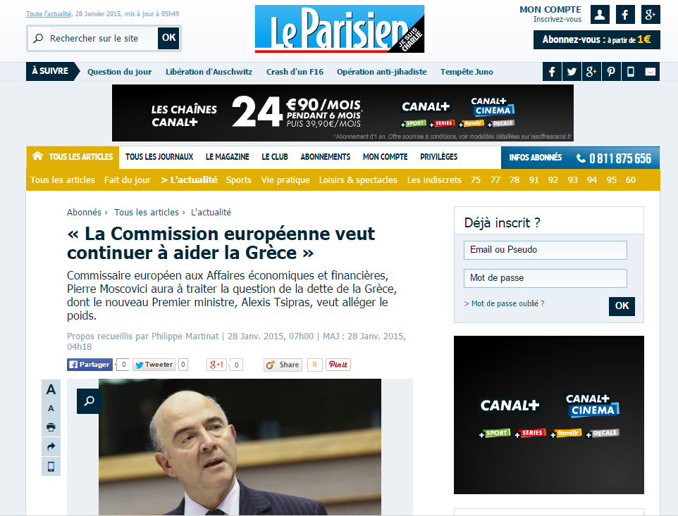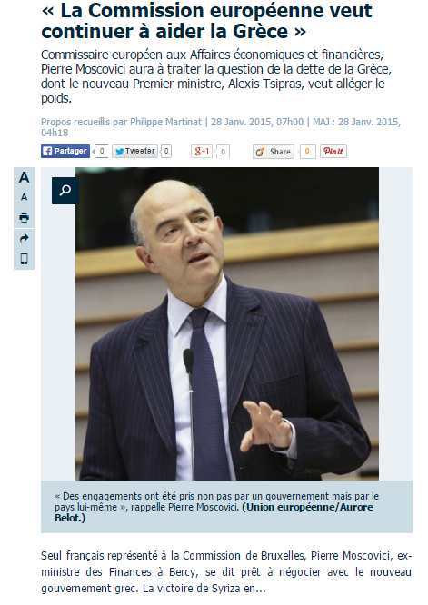 Ο ευρωπαίος επίτροπος Οικονομικών και Δημοσιονομικών Υποθέσεων, ο Γάλλος Πιέρ Μοσκοβισί, αποκλείει οποιαδήποτε “ρήξη” ανάμεσα στην Ευρωπαϊκή Επιτροπή και τις νέες ελληνικές αρχές, σε συνέντευξή του που δημοσιεύεται σήμερα στην εφημερίδα Le Parisien/Aujourd’hui en France.