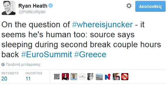Ο Ράιν Χιθ με ένα tweet ενημέρωσε πως σύμφωνα με πηγές ο Ζαν Κλοντ Γιούνκερ αποσύρθηκε σε κάποιο από τα γραφεία και πήρε έναν 2ωρο υπνάκο εκμεταλλευόμενος τη νέα διακοπή για την τετραμερή λυγίζοντας από την κούραση.