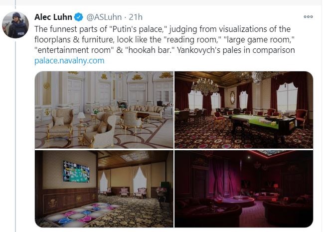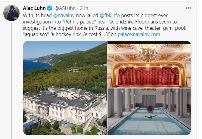 Στην αντεπίθεση πέρασε ο Αλεξέι Ναβάλνι μετά τη σύλληψή του κατά την άφιξή του στη Μόσχα. Καθώς εκείνος φυλακίστηκε, οι συνεργάτες του δίνουν στη δημοσιότητα φωτογραφίες και βίντεο από το “Παλάτι”, όπως το χαρακτηρίζουν, του Ρώσου προέδρου, τις πιο μυστικές και καλά φυλαγμένες εγκαταστάσεις στη χώρα. Όπως σημειώνουν στον ιστότοπό τους, δεν πρόκειται για ένα απλό εξοχικό, ή μια απλή κατοικία, αλλά για μια ολόκληρη πόλη, καλύτερα ένα “βασίλειο”. Σύμφωνα με τους συνεργάτες του Ναβάλνι, αυτό το βίντεο δημιουργήθηκε πριν εκείνος επιστρέψει στη χώρα αλλά δεν το έδωσαν στη δημοσιότητα για να μην πιστεύει ο Πούτιν ότι τον φοβούνται και το δημοσιοποιούν από την ασφάλεια της απόστασης. Ωστόσο, αμέσως μετά την επιστροφή του Αλεξέι Ναβάλνι και τη σύλληψή του κρίθηκε ότι ήταν η κατάλληλη στιγμή.