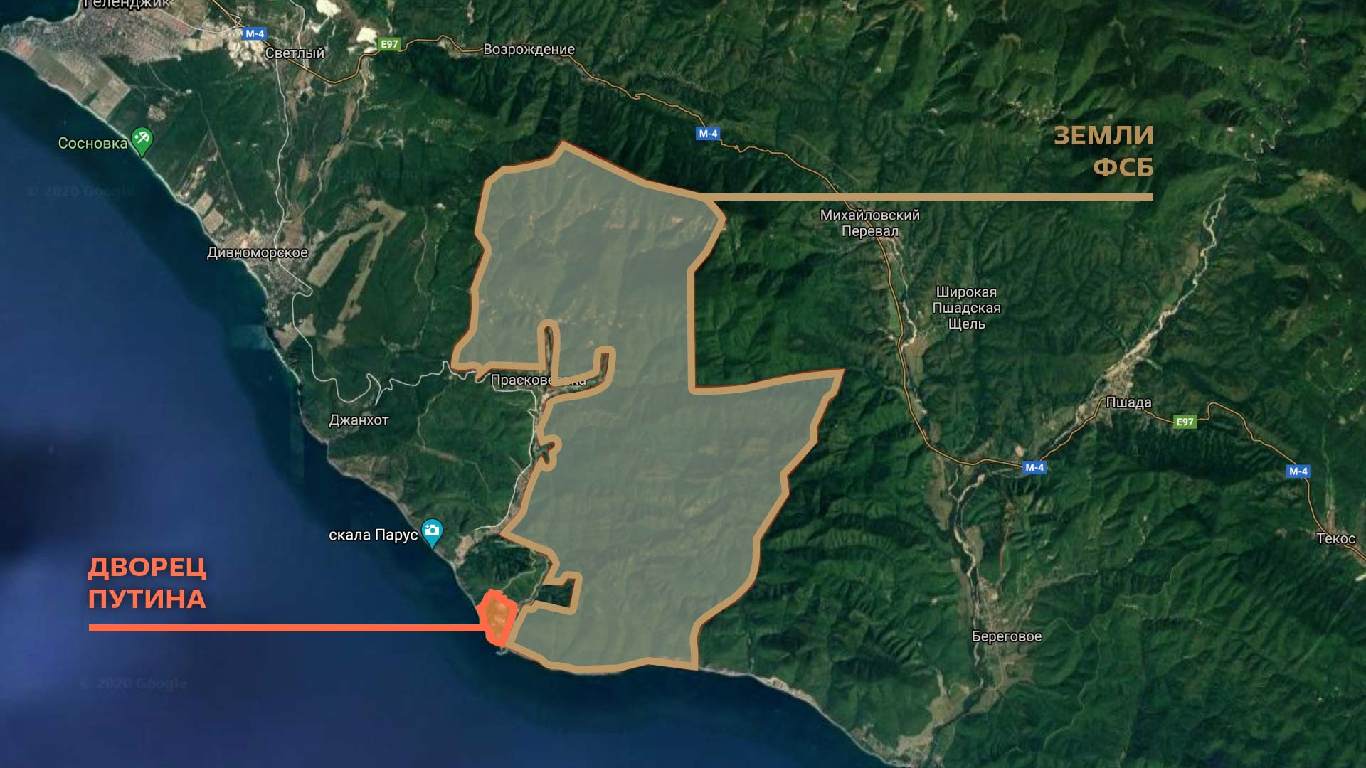 Η ομάδα Ναβάλνι επισημαίνει ότι πρόκειται για κράτος εν κράτει, καθώς η έκταση διαθέτει απόρθητους φράχτες, το δικό της λιμάνι με τη δική της φύλαξη, εκκλησία, ανεξάρτητο έλεγχο πρόσβασης. ζώνη απαγόρευσης πτήσεων και ακόμη δικό της συνοριακό σημείο ελέγχου. Χαρακτηρίζουν βασιλιά τον Πούτιν στο βασίλειό του και τονίζουν πως όποιος δει το εσωτερικό του θα αντιληφθεί ότι ο Ρώσος Πρόεδρος είναι ψυχικά άρρωστος. Είχε εμμονή με τον πλούτο και την πολυτέλεια. Έχει την έκταση 39 φορές του Πριγκιπάτου του Μονακό και δεν μπορεί κανείς να προσεγγίσει ούτε από στεριά, ούτε από θάλασσα ούτε από αέρα. Όσοι εργάζονται εκεί απαγορεύεται να έχουν πάνω τους κινητό τηλέφωνο με φωτογραφική μηχανή, σημειώνουν οι συνεργάτες του Ναβάλνι ενώ προσθέτουν ότι τα αυτοκίνητα που φθάνουν στο σημείο ελέγχονται εξονυχιστικά σε αρκετά σημεία ελέγχου με τη βοήθεια καθρεφτών αλλά και βιντεοκάμερες, ενώ εξετάζονται τα ντουλαπάκια ακόμη και τα πορτ μπαγκάζ. Έκαναν τέσσερις απόπειρες να καταγράψουν το υλικό που δημοσιοποιούν και τα κατάφεραν μόλις μία. Η έκταση είναι κοντά στο Γκελέντζικ.