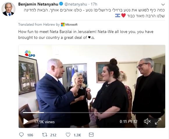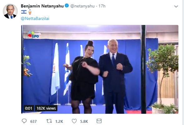 Σε βίντεο που ανάρτησε ο Ισραηλινός πρωθυπουργός στο Twitter παρουσιάζεται μαζί με την Μπαρζιλάι να χτυπούν τους αγκώνες τους στο πλάι του σώματός τους, κάνοντας την χαρακτηριστική αυτή κίνηση που έκανε η νικήτρια της Eurovision κατά την παρουσίαση του τραγουδιού της.