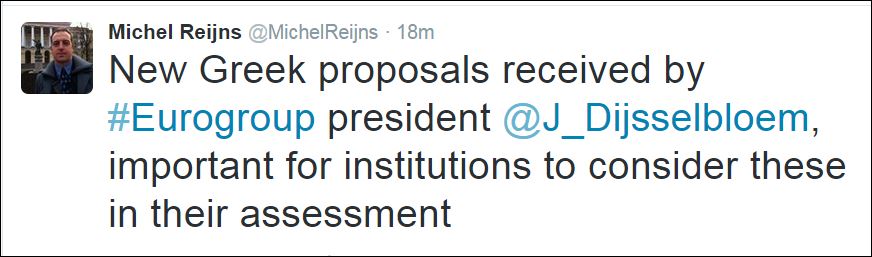 Ανάρτηση στο προσωπικό του λογαριασμό, στο twitter έκανε ο εκπρόσωπος του του προέδρου του Eurogroup Γερούν Ντάισελμπλουμ, Μισέλ Ρέινς ότι έλαβε την πρόταση της ελληνικής κυβέρνησης.