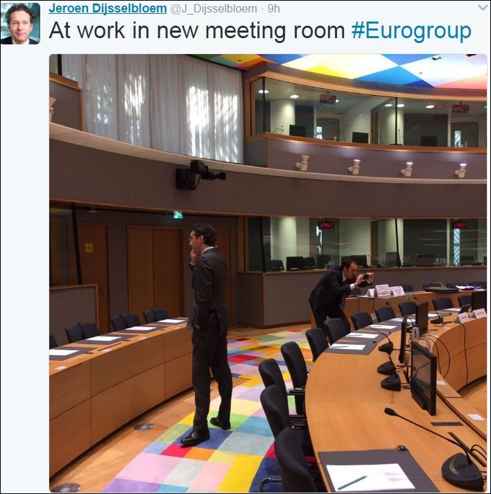 Ο πρόεδρος του Eurogroup, ανεβάζοντας μία φωτογραφία στον προσωπικό του λογαριασμό στο twitter, θέλησε να δείξει τη νέα αίθουσα συσκέψεων, η οποία είναι όπως φαίνεται, φωτεινότερη από την προηγούμενη.