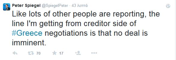 Τα σενάρια των τελευταίων ωρών που θέλουν την Ελλάδα να φτάνει σε συμφωνία με τους Θεσμούς αμφισβητεί ο δημοσιογράφος των Financial Times, Peter Spiegel, με ανάρτηση του στο Twitter. Συγκεκριμένα, ο Peter Spiegel έγραψε: «Όπως πολλοί άλλοι μεταδίδουν, η γραμμή που παίρνω εγώ από την πλευρά των δανειστών σε ό,τι αφορά τη διαπραγμάτευση με την Ελλάδα είναι ότι δεν επίκειται συμφωνία», έγραψε.