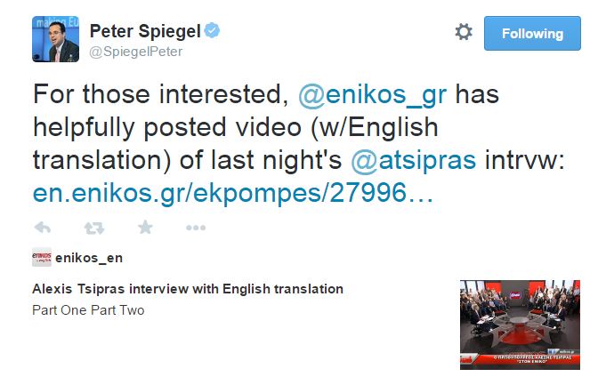 Ο δημοσιογράφος των Financial Times, Peter Spiegel δημοσίευσε στον προσωπικό του λογαριασμό στο twitter το link της συνέντευξης του Πρωθυπουργού, Αλέξη Τσίπρα, στον Νίκο Χατζηνικολάου, «στον ενικό».