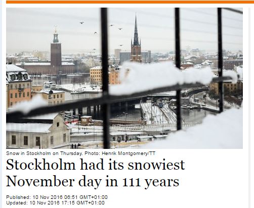 Σύμφωνα με την εθνική μετεωρολογική υπηρεσία SMHI έχουν πέσει 30 εκατοστά χιόνι, ενώ το προηγούμενο ρεκόρ είχε καταγραφεί το 1985 και το 2004 αντίστοιχα που είχαν πέσει 29 εκατοστά μέσα σε μία ημέρα.