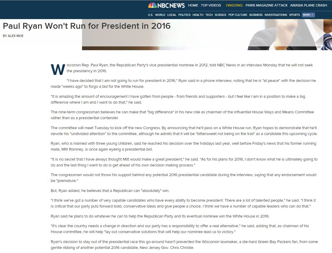 «Έχω αποφασίσει να μην θέσω υποψηφιότητα για πρόεδρος το 2016» είπε ο Ράιαν μιλώντας τηλεφωνικά στο NBC News.