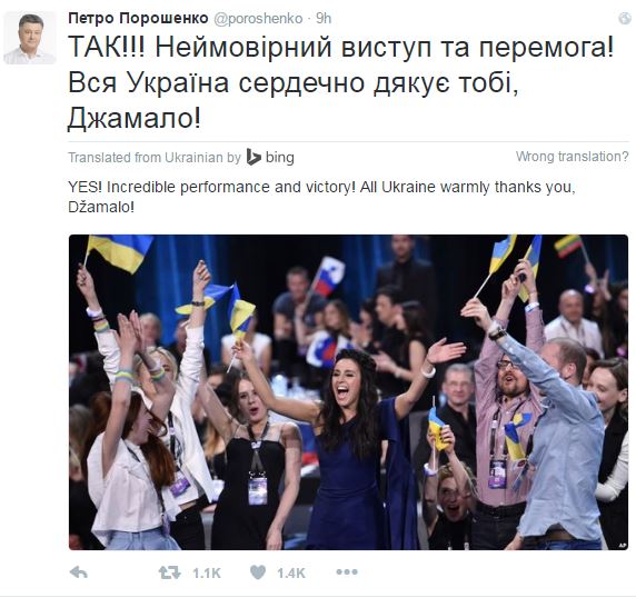 “Ναι!!!” έγραψε ο Ποροσένκο σε μήνυμά του στο Twitter. “Μια εμφάνιση και μια νίκη απίστευτη! Όλη η Ουκρανία σας λέει ένα μεγάλο ευχαριστώ Τζαμάλα”.