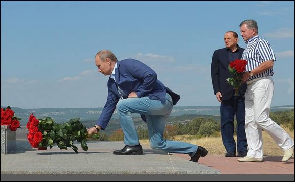 Συνοδευόμενος από τον Πούτιν και τον πρωθυπουργό της Κριμαίας Σεργκέι Αξιόνοφ, ο Σίλβιο Μπερλουσκόνι κατέθεσε ένα στεφάνι από κόκκινα τριαντάφυλλα στο μνημείο που είναι αφιερωμένο στη μνήμη των Ιταλών στρατιωτών που σκοτώθηκαν κατά τη διάρκεια του πολέμου της Κριμαίας, μεταξύ 1853 και 1856.