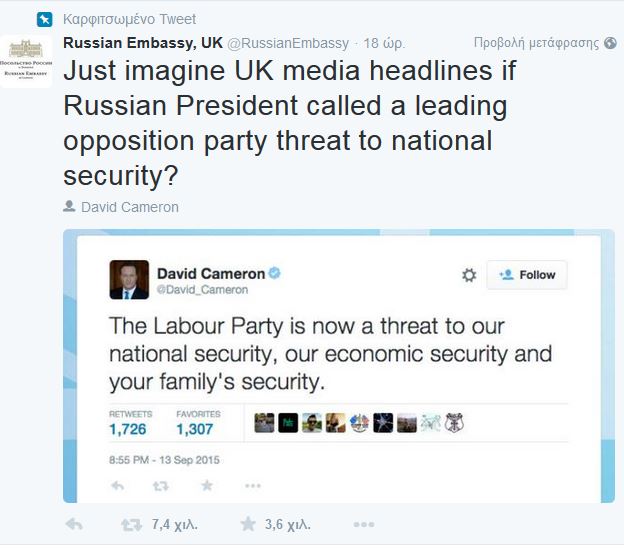 «Απλά φανταστείτε τους κεντρικούς τίτλους σε βρετανικά media εάν ο Ρώσος Πρόεδρος αποκαλούσε κάποιο ηγετικό στέλεχος της αντιπολίτευσης ως απειλή για την εθνική ασφάλεια;», γράφει το tweet της ρώσικης πρεσβείας στο Λονδίνο.