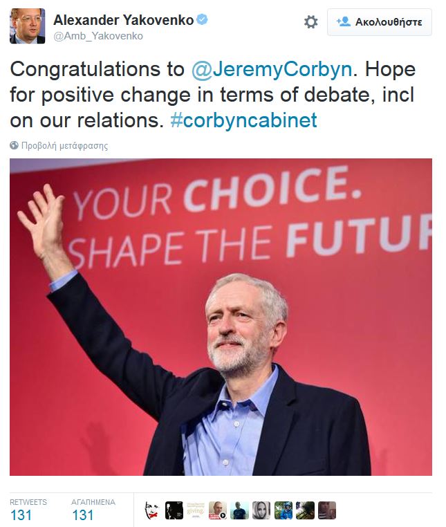 Ταυτόχρονα υπήρξε και retweet του ρώσου πρεσβευτή στη Βρετανία ο οποίος συγχαίρει τον Κόρμπιν για τη νίκη του και την εκλογή του στην ηγεσία των Εργατικών εκφράζοντας τις ελπίδες του για μια «θετική αλλαγή στις συζητήσεις και στις σχέσεις μας».