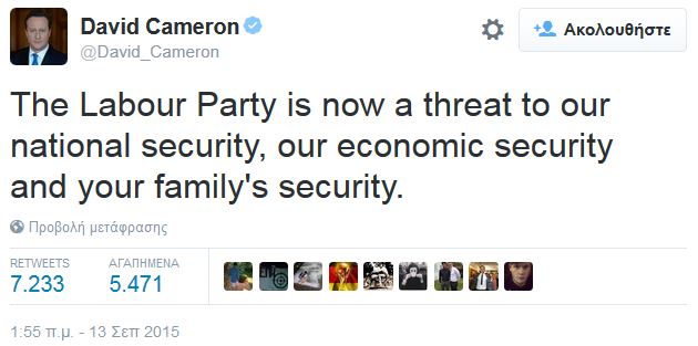 “Οι Εργατικοί συνιστούν τώρα απειλή για την εθνική μας ασφάλεια , την οικονομική μας ασφάλεια και την ασφάλεια της οικογένειάς σας”, έγραψε ο Κάμερον στον λογαριασμό του στο twitter.