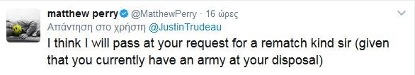 Μπορεί να άργησε, αλλά δεν ξέχασε ο Πρωθυπουργός του Καναδά Τζάστιν Τριντό το ξύλο που έφαγε όταν πήγαινε στο δημοτικό στην Οττάβα, από τον ηθοποιό Μάθιου Πέρι.Βέβαια σε αυτό βοήθησε και ο ίδιος ο Πέρι καθώς, όταν πριν από περίπου δύο εβδομάδες έδωσε συνέντευξη στην εκπομπή του Τζίμι Κίμελ, θυμήθηκε το περιστατικό λέγοντας: «Ο πατέρας του ήταν Πρωθυπουργός, αλλά δεν νομίζω ότι ήταν αυτός ο λόγος που τον χτυπήσαμε. Νομίζω ότι ήταν το μοναδικό παιδί στο σχολείο που μπορούσαμε να δείρουμε… δεν υπερηφανεύομαι για αυτό. Ήμουν ένα χαζό παιδί».Μάλιστα στην ίδια εκπομπή ο «Τσάντλερ» της τηλεοπτικής σειράς «Φιλαράκια», είπε πως τον Τζάστιν Τριντό, που ήταν κατά δύο χρόνια μικρότερός του, τον χτύπησε μαζί με έναν άλλον συμμαθητή του, «από καθαρή ζήλια», καθώς ο νεαρός Τζάστιν ήταν καλύτερος στον αθλητισμό.Ο 45χρονος Πρωθυπουργός του Καναδά επέλεξε την ημέρα της Πρωταπριλιάς να απαντήσει στον Μάθιου Πέρι, αναρτώντας στον λογαριασμό του στο Twitter ένα μήνυμα – πρόκληση γράφοντας: «Μου έχει έρθει μία ιδέα, και ξέρετε τι, θα ήθελα να δώσω μία γροθιά στον Τσάντλερ @MatthewPerry».
