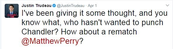 Μπορεί να άργησε, αλλά δεν ξέχασε ο Πρωθυπουργός του Καναδά Τζάστιν Τριντό το ξύλο που έφαγε όταν πήγαινε στο δημοτικό στην Οττάβα, από τον ηθοποιό Μάθιου Πέρι.Βέβαια σε αυτό βοήθησε και ο ίδιος ο Πέρι καθώς, όταν πριν από περίπου δύο εβδομάδες έδωσε συνέντευξη στην εκπομπή του Τζίμι Κίμελ, θυμήθηκε το περιστατικό λέγοντας: «Ο πατέρας του ήταν Πρωθυπουργός, αλλά δεν νομίζω ότι ήταν αυτός ο λόγος που τον χτυπήσαμε. Νομίζω ότι ήταν το μοναδικό παιδί στο σχολείο που μπορούσαμε να δείρουμε… δεν υπερηφανεύομαι για αυτό. Ήμουν ένα χαζό παιδί».Μάλιστα στην ίδια εκπομπή ο «Τσάντλερ» της τηλεοπτικής σειράς «Φιλαράκια», είπε πως τον Τζάστιν Τριντό, που ήταν κατά δύο χρόνια μικρότερός του, τον χτύπησε μαζί με έναν άλλον συμμαθητή του, «από καθαρή ζήλια», καθώς ο νεαρός Τζάστιν ήταν καλύτερος στον αθλητισμό.Ο 45χρονος Πρωθυπουργός του Καναδά επέλεξε την ημέρα της Πρωταπριλιάς να απαντήσει στον Μάθιου Πέρι, αναρτώντας στον λογαριασμό του στο Twitter ένα μήνυμα – πρόκληση γράφοντας: «Μου έχει έρθει μία ιδέα, και ξέρετε τι, θα ήθελα να δώσω μία γροθιά στον Τσάντλερ @MatthewPerry».
