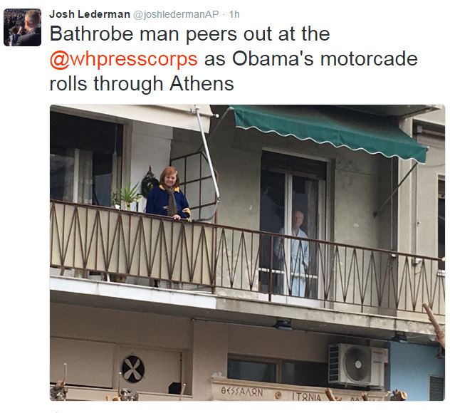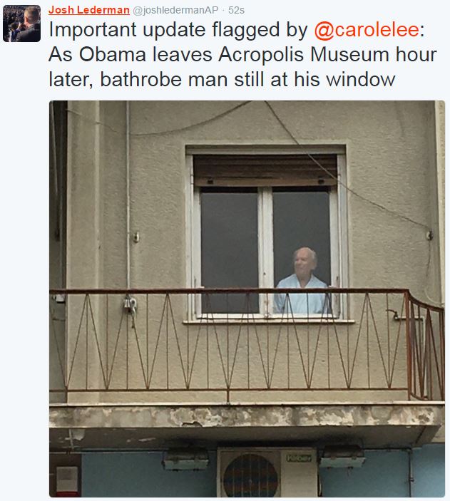Αρχικά, ανέβασε στο twitter του την χαρακτηριστική φωτογραφία κατά την άφιξη του Ομπάμα στην Ακρόπολη, και πριν από λίγο, τον παρατήρησε εκ νέου, βάζοντας μία νέα φωτογραφία με το σχόλιο: «Ο άνθρωπος με το μπουρνούζι είναι ακόμα εδώ».