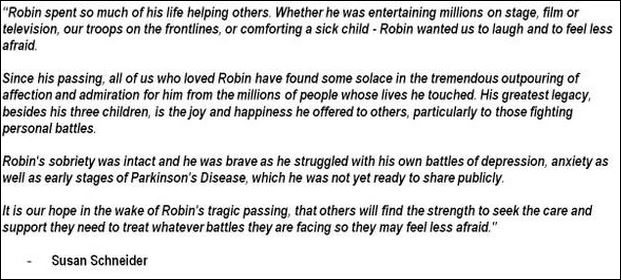 “Το ότι ο Ρόμπιν ήταν “καθαρός” είναι δεδομένο και ήταν γενναίος καθώς έδινε το δική του μάχη ενάντια στην κατάθλιψη, το άγχος καθώς επίσης και τα πρώτα στάδια της νόσου του Πάρκινσον, πράγμα το οποίο δεν ήταν έτοιμος να μοιραστεί δημόσια”.