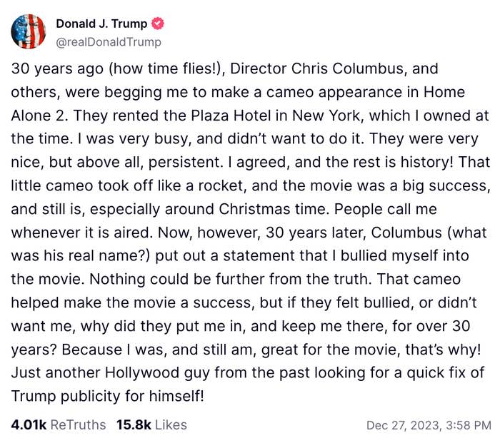 Από την πλευρά του, ο Τραμπ έχει εντελώς διαφορετική εκδοχή για το πώς βρέθηκε στην ταινία. Σε ανάρτηση του 2023 στο Truth Social, υποστήριξε ότι ο σκηνοθέτης ήταν αυτός που «τον παρακαλούσε» να εμφανιστεί στο φιλμ.