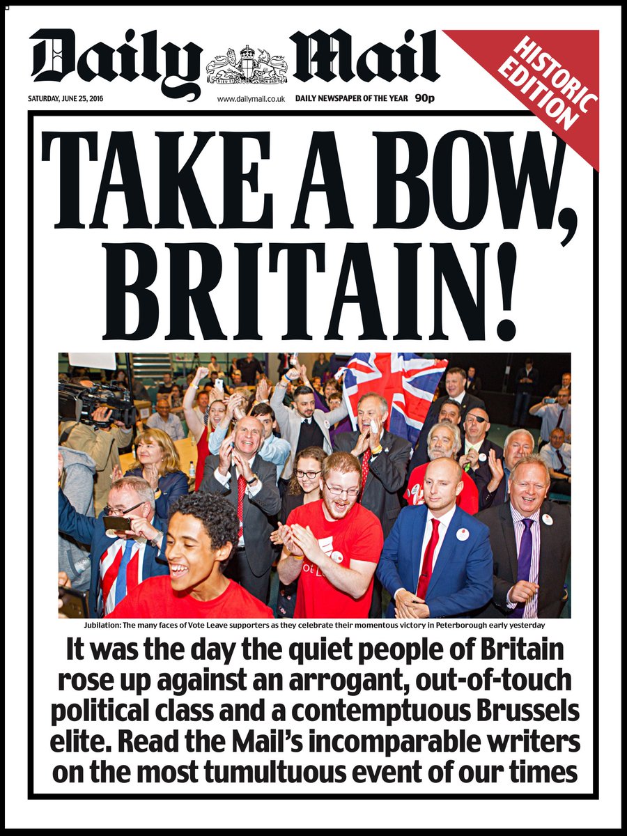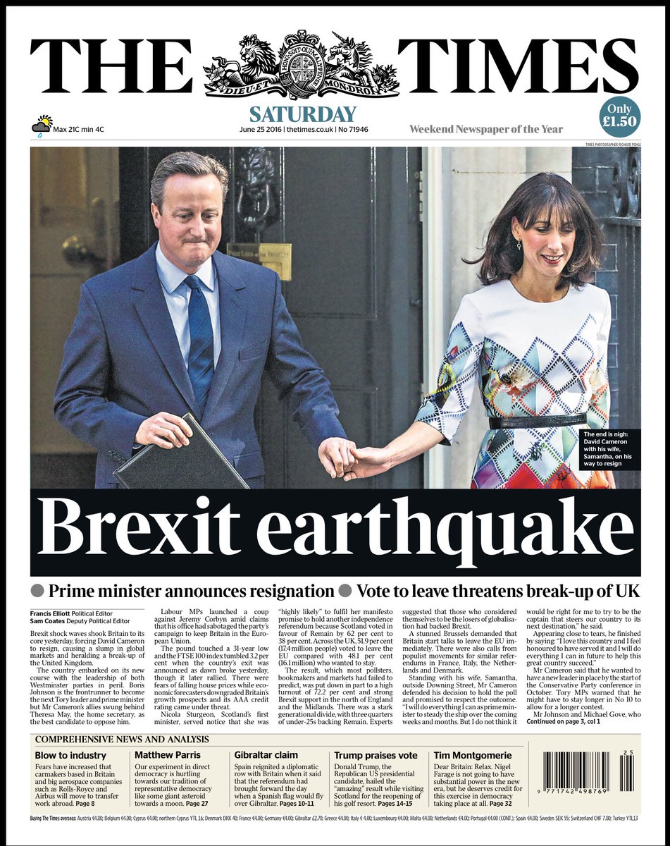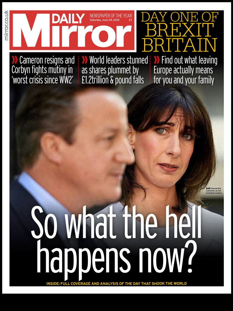Η Mirror έγραφε χαρακτηριστικά στο πρωτοσέλιδο της: «Έτσι τι στο διάβολο συμβαίνει τώρα;», ενώ οι Times έκαναν λόγο για «Σεισμό Brexit».