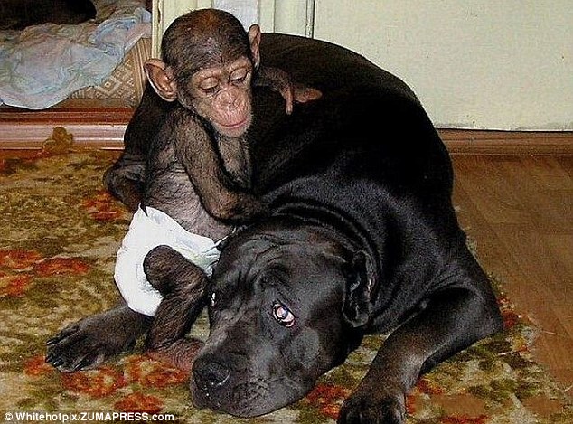 Ο μικρός χιμπατζής, εγκαταλείφθηκε από την μητέρα του και πλέον απολαμβάνει την ”μητρική” αγκαλιά του μεγάλου μαύρου σκυλιού.