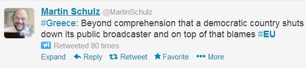 Το κλείσιμο της δημόσιας τηλεόρασης σχολίασε μέσω twitter o πρόεδρος του Ευρωπαϊκού κοινοβουλίου, Μάρτιν Σουλτς.