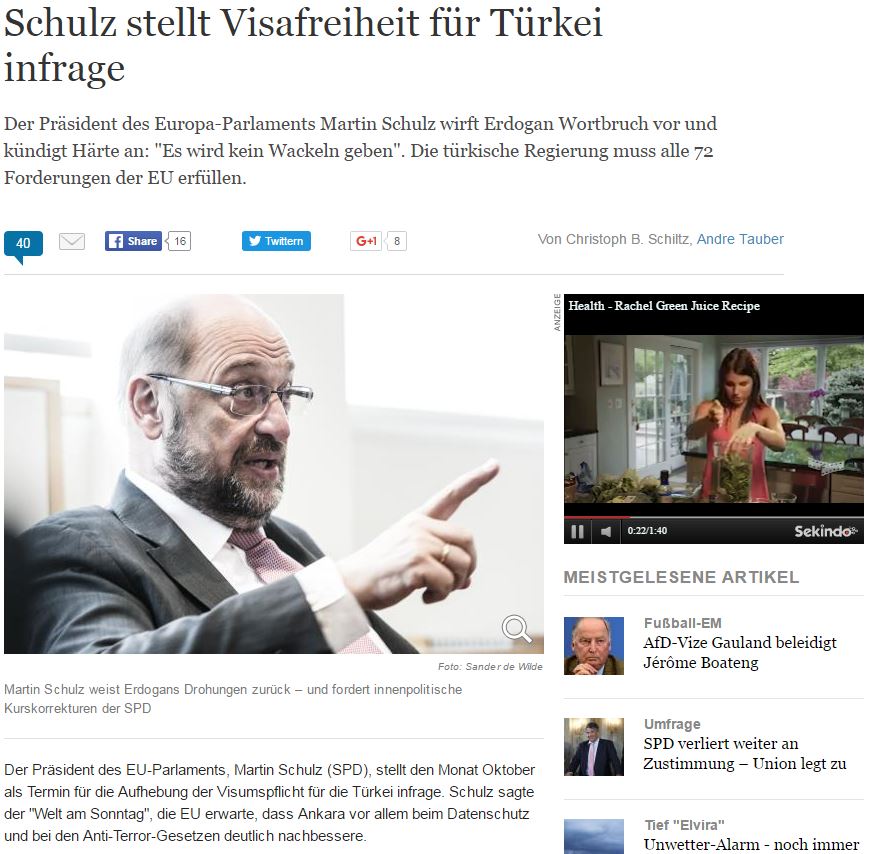 Για αθέτηση λόγου κατηγορεί την Τουρκία ο πρόεδρος του Ευρωπαϊκού Κοινοβουλίου, Μάρτιν Σουλτς, στο θέμα της αλλαγής του αντιτρομοκρατικού νόμου, προκειμένου να χορηγηθεί βίζα στους πολίτες της και προαναγγέλλει σκλήρυνση της στάσης της Ευρώπης, σε συνέντευξή του στην Die Welt.