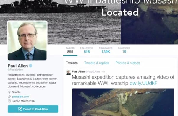«Ο κ. Άλεν έψαχνε για το Μουσάσι για παραπάνω από 8 χρόνια και η ανακάλυψη αυτή θα βοηθήσει όχι μόνο να ολοκληρωθεί η ιστορία του πλοίου αλλά και να δώσει ένα συναισθηματικό κλείσιμο στις οικογένειες εκείνων που έχασαν τη ζωή τους», αναφέρεται σε σχετική ανακοίνωση που ανήρτησε ο Άλεν στην ιστοσελίδα του, αναφέρει το ΑΠΕ-ΜΠΕ .