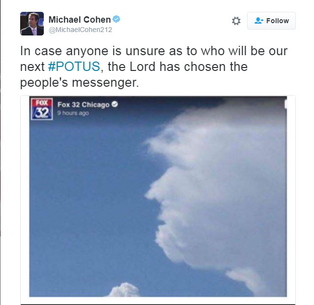 Ο Μάικλ Κοέν , δικηγόρος του μεγιστάνα και υποψήφιου του Ρεπουμπλικανικού κόμματος για την προεδρία των ΗΠΑ ανάρτησε στο Twitter την φωτογραφία ενός σύννεφου που το σχήμα του θυμίζει το κεφάλι του Ντόναλντ Τραμπ και έγραψε: «Σε περίπτωση που κάποιος δεν είναι σίγουρος ποιος θα είναι ο επόμενος πρόεδρος των ΗΠΑ, ο Κύριος έχει επιλέξει ποιος είναι ο αγγελιοφόρος του λαού».