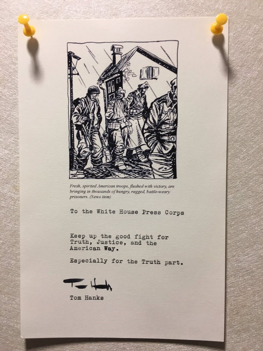 «Στους δημοσιογράφους του Λευκού Οίκου. Συνεχίστε τον δίκαιο αγώνα σας για την αλήθεια, τη δικαιοσύνη και την αμερικανική παράδοση. Πάνω απ’ όλα την αλήθεια», έγραψε ο Τομ Χανκς.