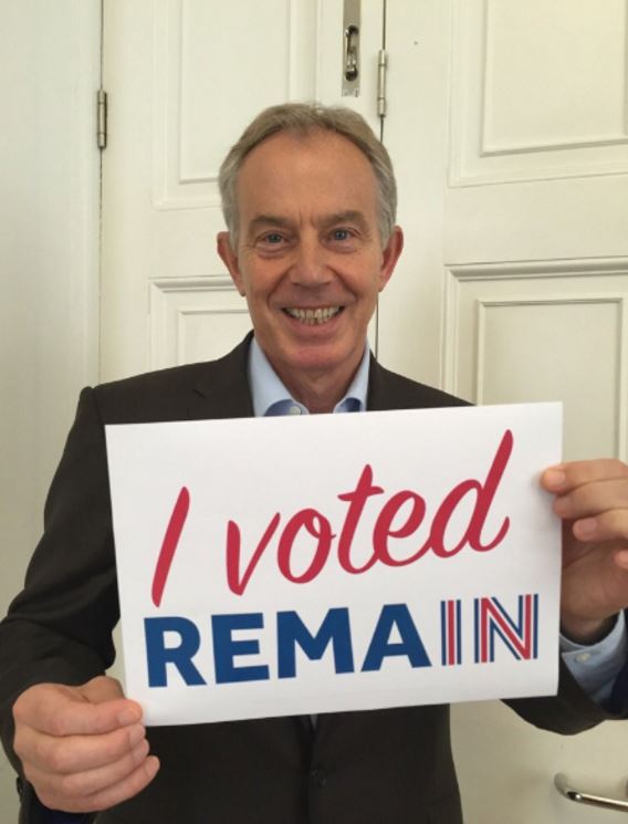 Λίγες ώρες πριν το κρίσιμο δημοψήφισμα για την παραμονή ή όχι της Βρετανίας στην Ευρωπαϊκή Ένωση, ο Τόνι Μπλερ ανήρτησε στο Twitter μια φωτογραφία του, στην οποία ποζάρει χαμογελαστός, κρατώντας μια αφίσα στην οποία αναγράφεται το εξής: «Ψήφισα υπέρ της παραμονής».