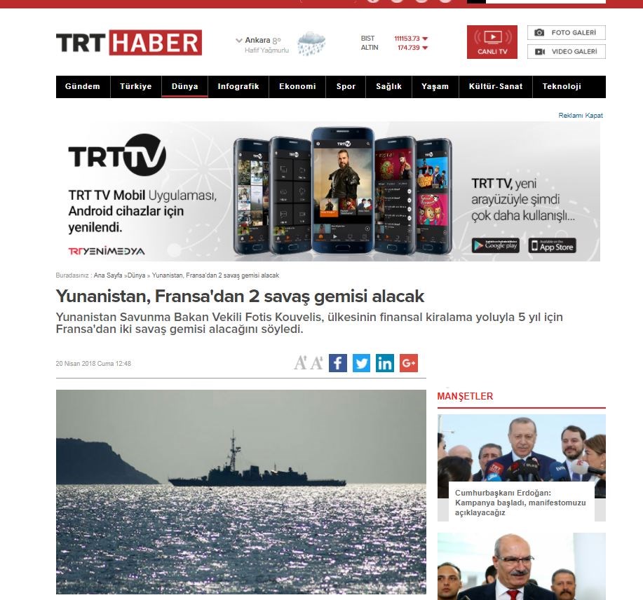 Όσο για το Trthaber αναφέρει ότι «η Ελλάδα θα πάρει δύο πολεμικά πλοία από τη Γαλλία» υπογραμμίζοντας ότι «οι Ελληνικές Ένοπλες Δυνάμεις εκσυγχρονίζονται με γαλλικά πλοία».