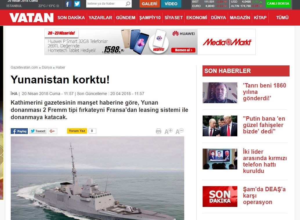 Η εφημερίδα Aksam αναφέρει ότι η Ελλάδα θα νοικιάσει φρεγάτες από τη Γαλλία παρότι υπόκειται σε αυστηρό έλεγχο των οικονομικών της από την Ευρωπαϊκή Ένωση και το Διεθνές Νομισματικό Ταμείο.
