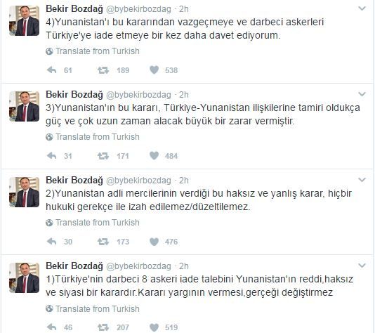 Επίθεση στην Ελλάδα για την απόφαση του Αρείου Πάγου να μην εκδοθούν οι οκτώ στρατιωτικοί που συμμετείχαν στο αποτυχημένο πραξικόπημα της 15ης Ιουλίου εξαπέλυσε μέσω Twitter ο Τούρκος υπουργός Δικαιοσύνης, Μπεκίρ Μποζντάγ.