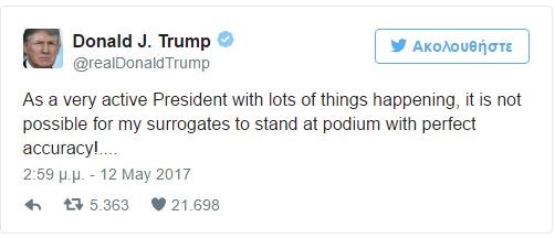 “Ως ένας πολύ δραστήριος Πρόεδρος, με πολλά πράγματα να συμβαίνουν, δεν είναι πιθανό για τους εκπροσώπους που να εμφανίζονται στο πόντιουμ με τέλεια ακρίβεια!… Ίσως το καλύτερο πράγμα θα είναι να ακυρώσουμε όλες τις μελλοντικές “ενημερώσεις του Τύπου” και να μοιράζουμε γραπτές απαντήσεις στο όνομα της χρονικής ακρίβειας???”, έγραψε χαρακτηριστικά σε tweet του ο Τραμπ θέλοντας, προφανώς να δείξει αντίδραση στη σφοδρή κριτική που του ασκείται από τα ΜΜΕ για την απόλυση του Κόμεϊ.