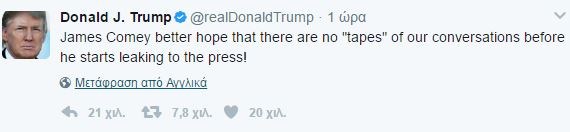 «Ο Τζέιμς Κόμεϊ καλύτερα να ελπίζει πως δεν υπάρχουν ‘κασέτες’ με [ηχογραφημένες] συνομιλίες μας πριν αρχίσει να κάνει διαρροές», έγραψε στο Twitter ο Τραμπ, ο οποίος είχε εξαπολύσει βαρύτατη επίθεση και το βράδυ της Πέμπτης στον τέως διευθυντή του FBI.