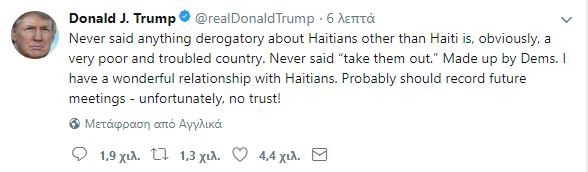 Πριν από λίγο, ο Αμερικανός Πρόεδρος σε νέα ανάρτησή του στο Twitter έγραψε: «δεν είπα ποτέ κάτι υποτιμητικό για τους Αϊτινούς, μόνο ότι η Αϊτή είναι, προφανώς, μια πολύ φτωχή και ταλαιπωρημένη χώρα».