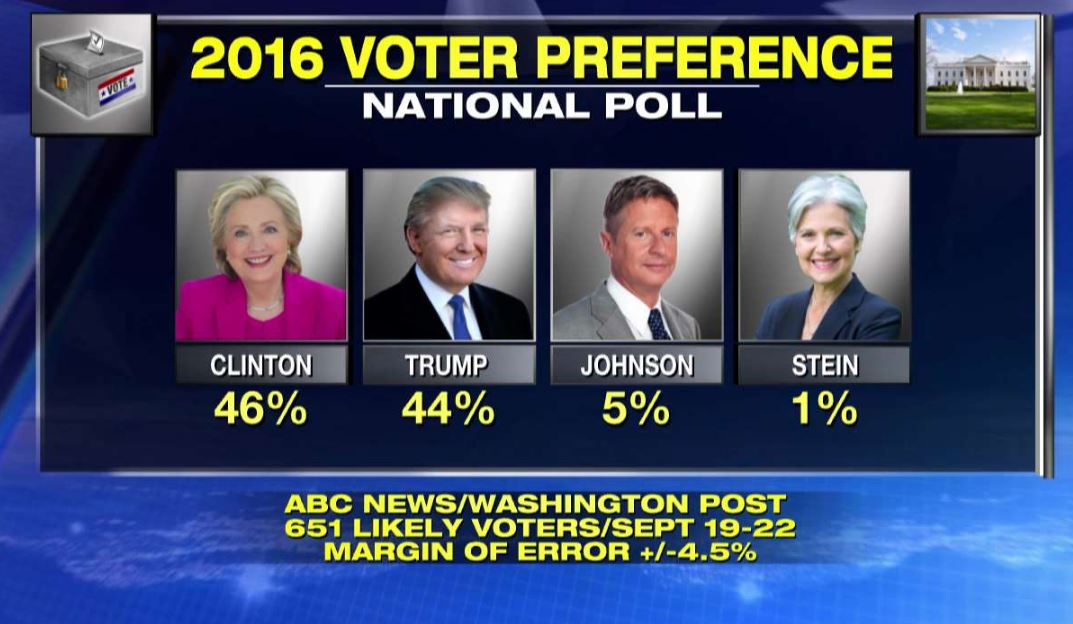 Συγκεκριμένα, ο υποψήφιος των Ρεπουμπλικάνων για την προεδρία συγκεντρώνει το 44% των προτιμήσεων έναντι 46% που φαίνεται να έχει η Δημοκρατική, Χίλαρι Κλίντον. Και αυτά τα νούμερα προκύπτουν από δείγμα 651 ατόμων στο διάστημα 19 έως 22 Σεπτεμβρίου.